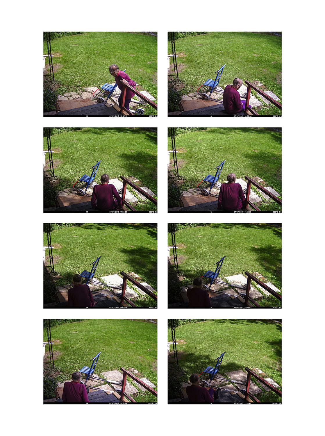 I first saw the surveillance camera images after my grandmother had already passed away. In them, my grandmother does repetitive yard work in the twilight of her life until she no longer appears in the pictures. The yard, however, is not emptied, but life after human presence continues.