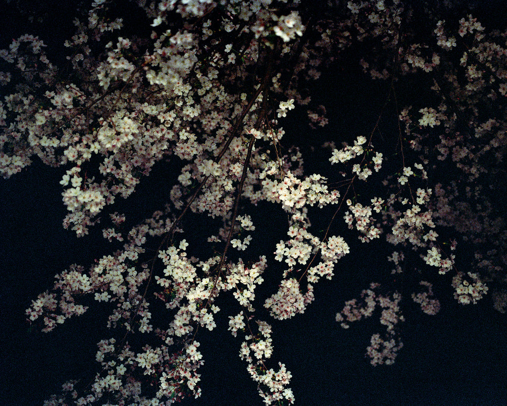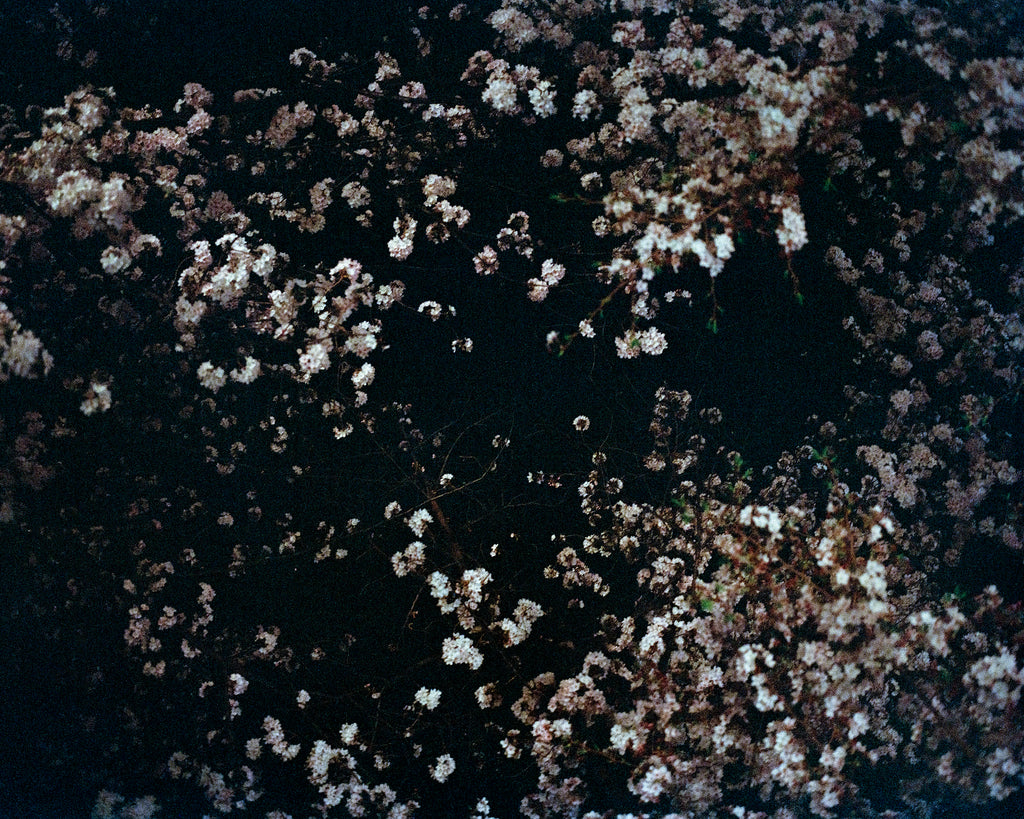 As a counterpoint, photographs of cherry trees – dense and granular, underexposed at nightfall – similarly and intimately depict the awareness of time passing. A new solar system, composed of hazy spheres, fugitive constellations, or small evanescent planets, emerges into abstraction. For centuries, the sakuras have metaphorically expressed a sensitivity to the ephemeral ; a spiritual symbol for the beauty of things, but also – through their impermanence – for the fragility of life.
