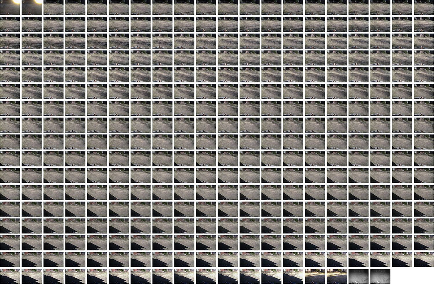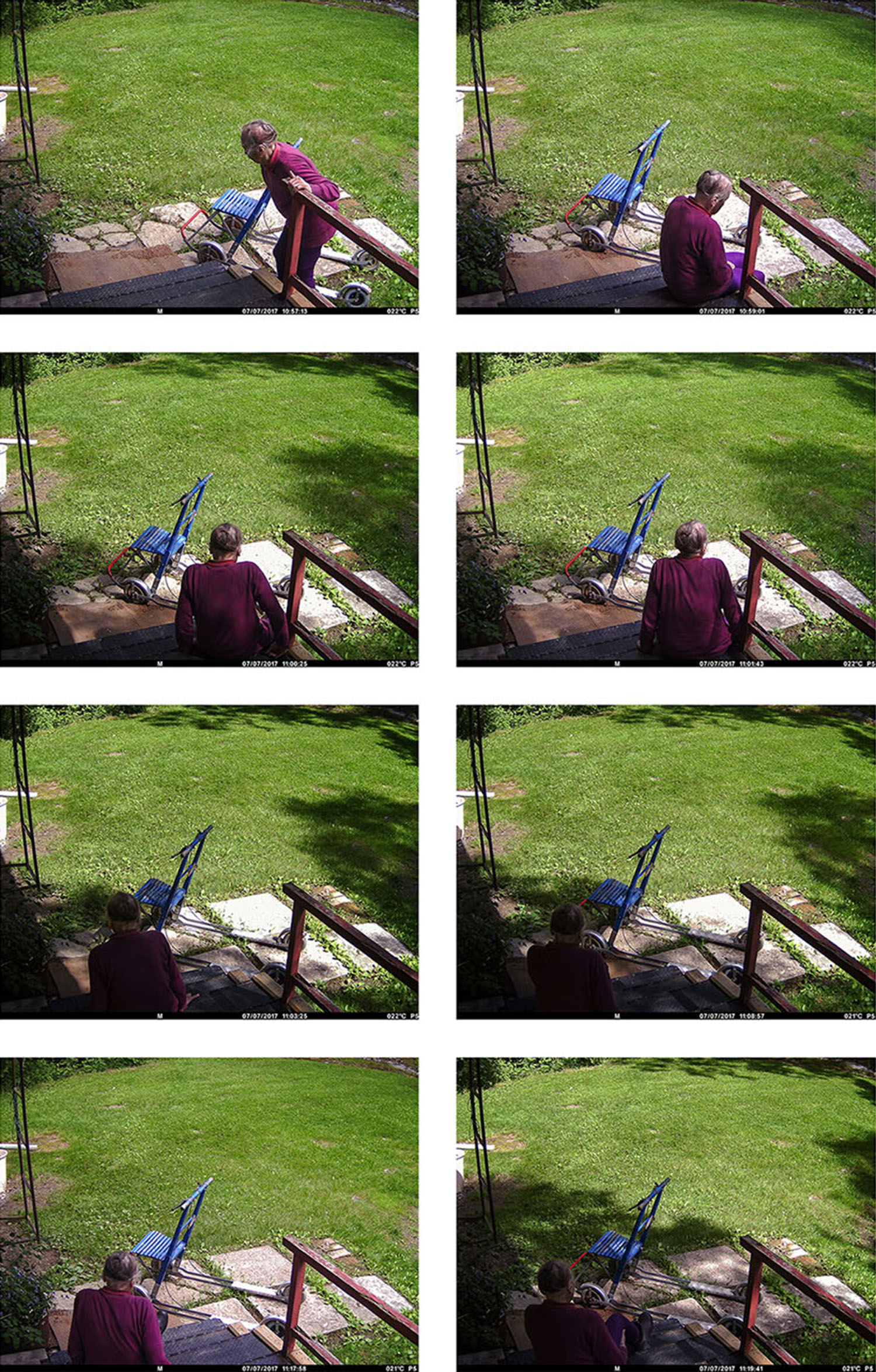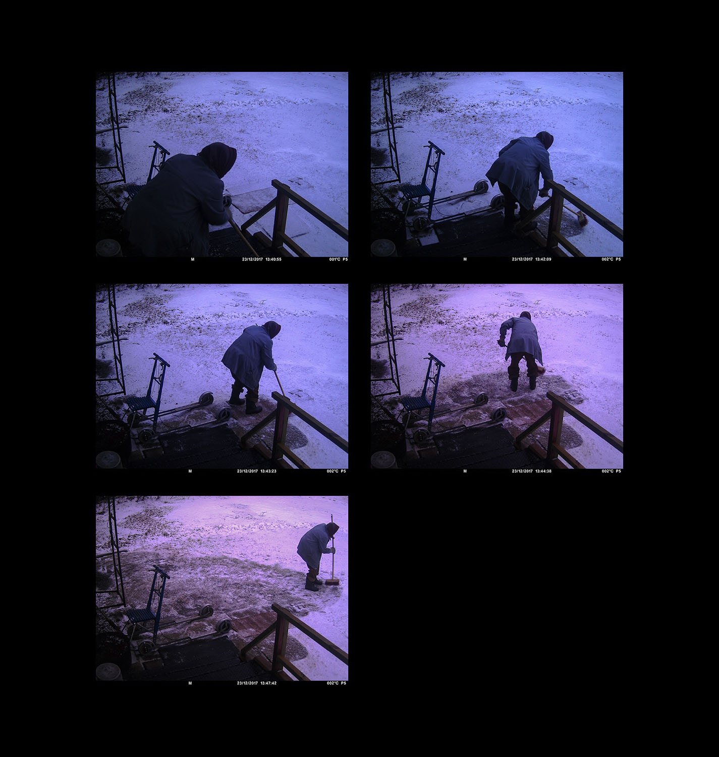 I first saw the surveillance camera images after my grandmother had already passed away. In them, my grandmother does repetitive yard work in the twilight of her life until she no longer appears in the pictures. The yard, however, is not emptied, but life after human presence continues.