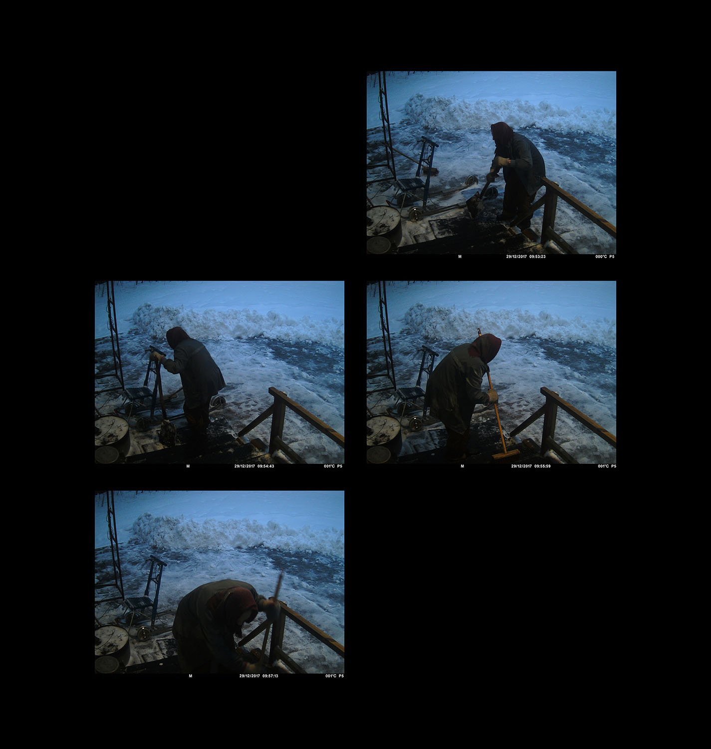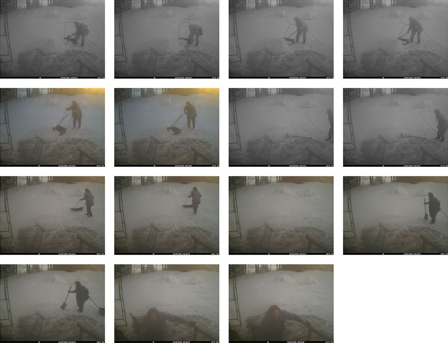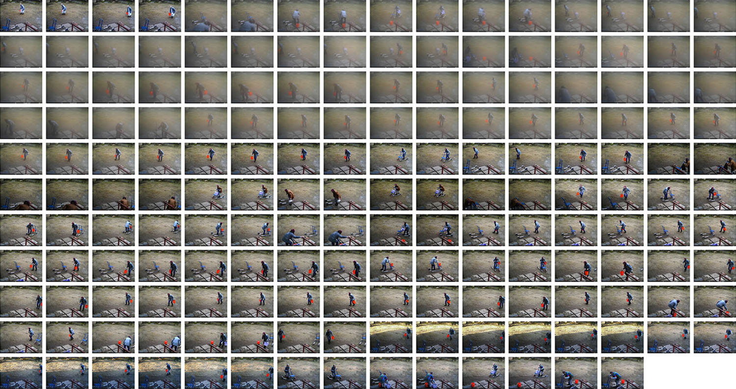I first saw the surveillance camera images after my grandmother had already passed away. In them, my grandmother does repetitive yard work in the twilight of her life until she no longer appears in the pictures. The yard, however, is not emptied, but life after human presence continues.