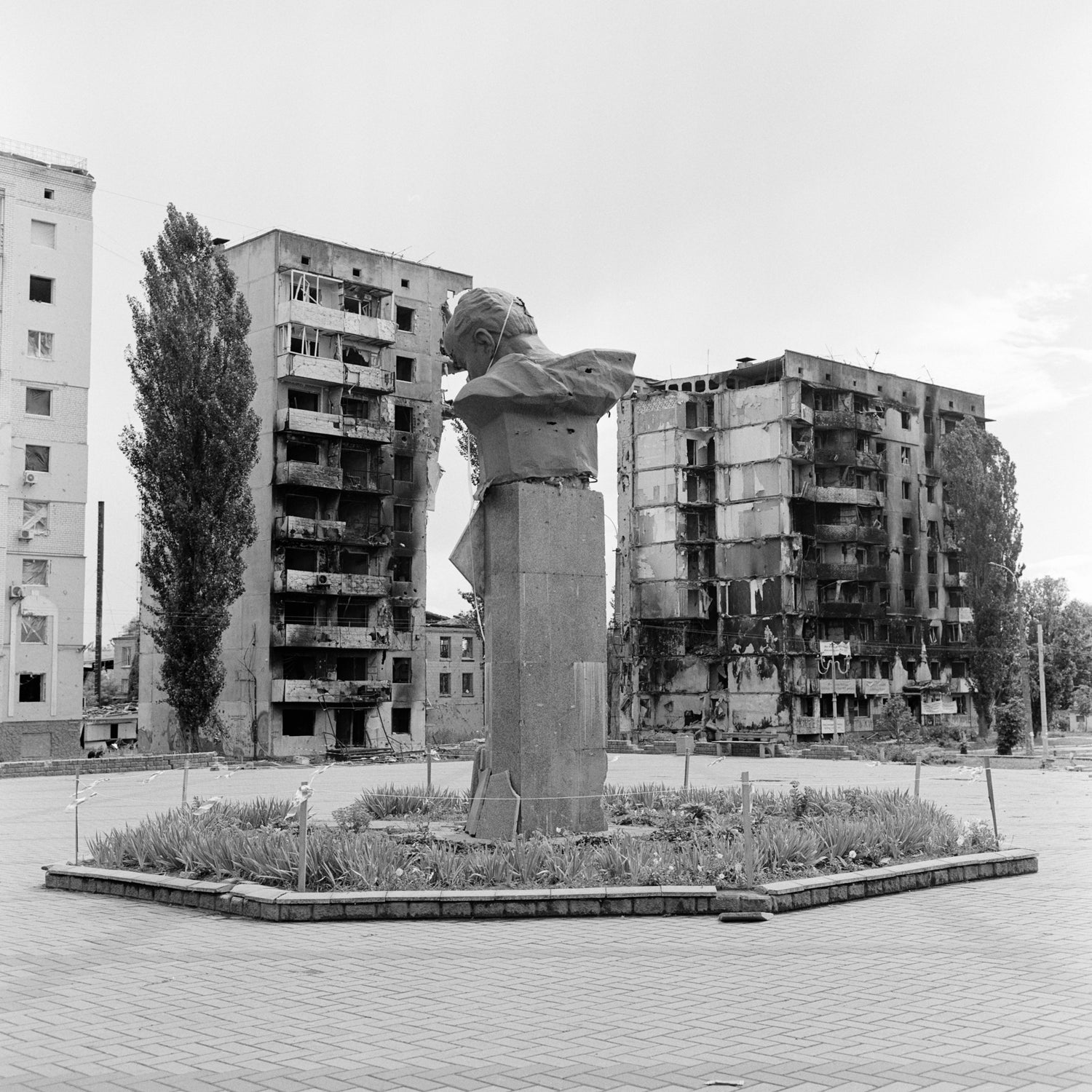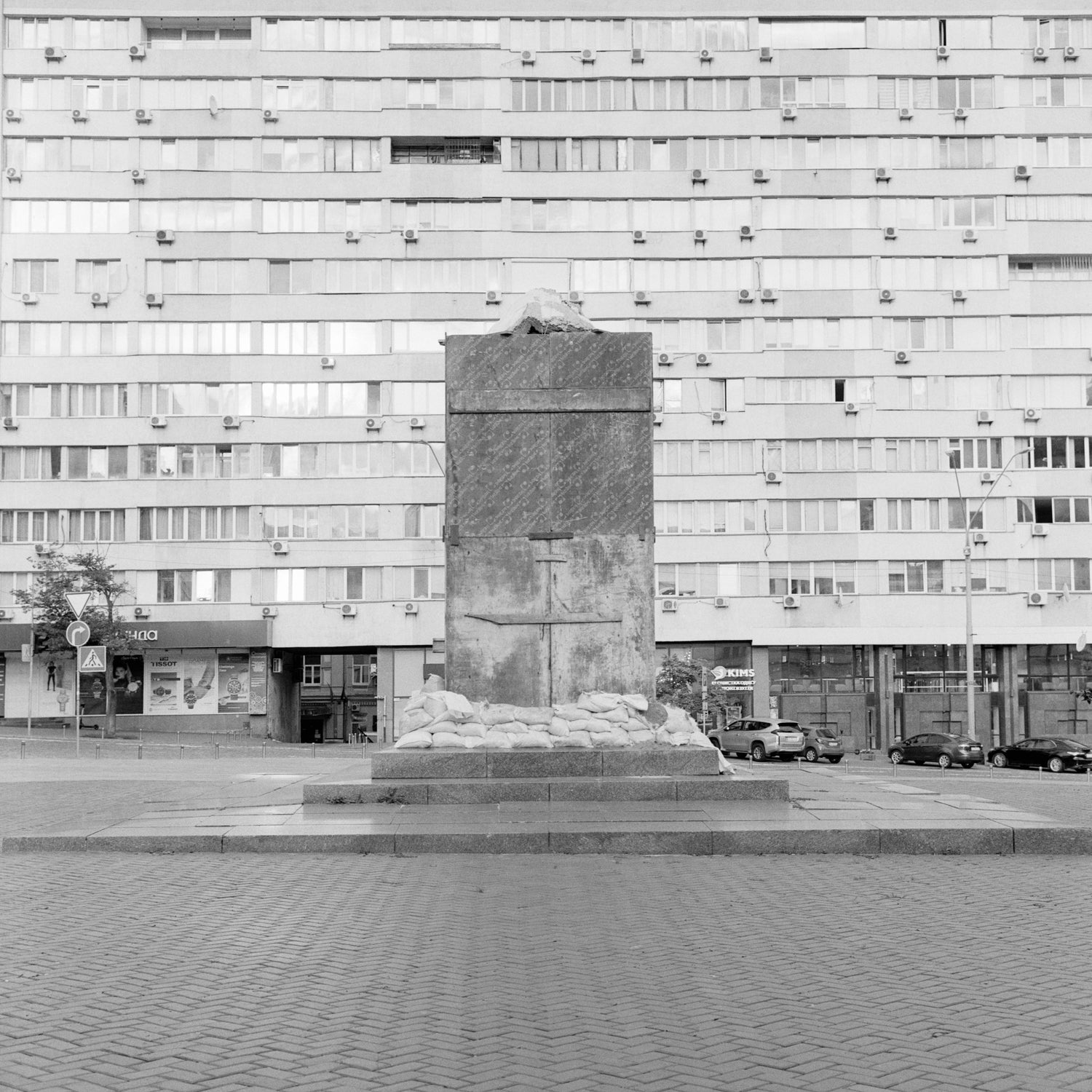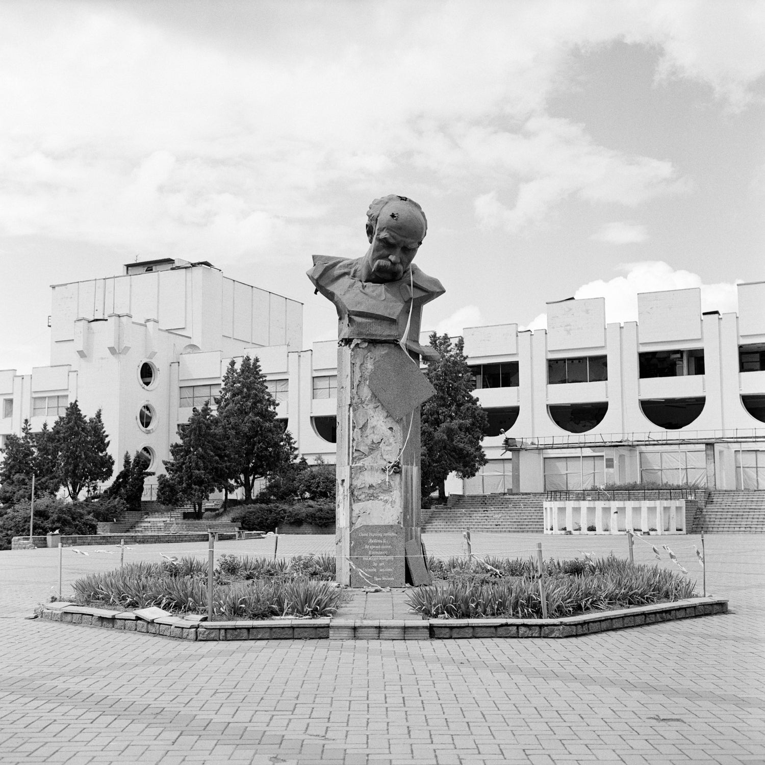 There is also one antagonistic, distracting element: a diptych of two photos of the same destroyed monument to Shevchenko in Brodzianka. The first one is an unambiguous representation of the destruction caused by the war, but limited to the object – that is, the monument itself. The second, on the other hand, shows the monument against the background of completely bombed blocks, showing the real tragedy of people living in a country torn by war. Maybe this project is not about monuments at all, as it might seem?“