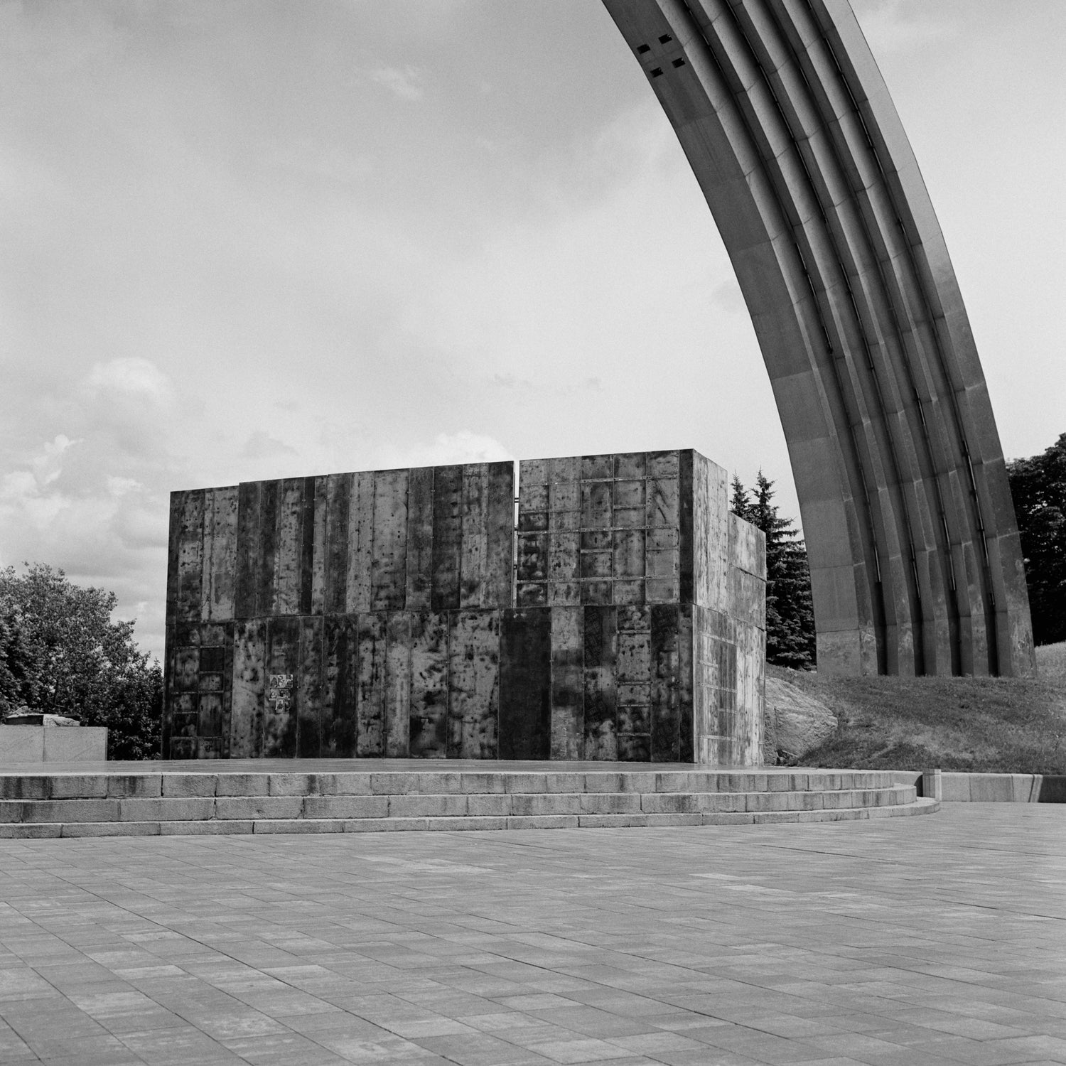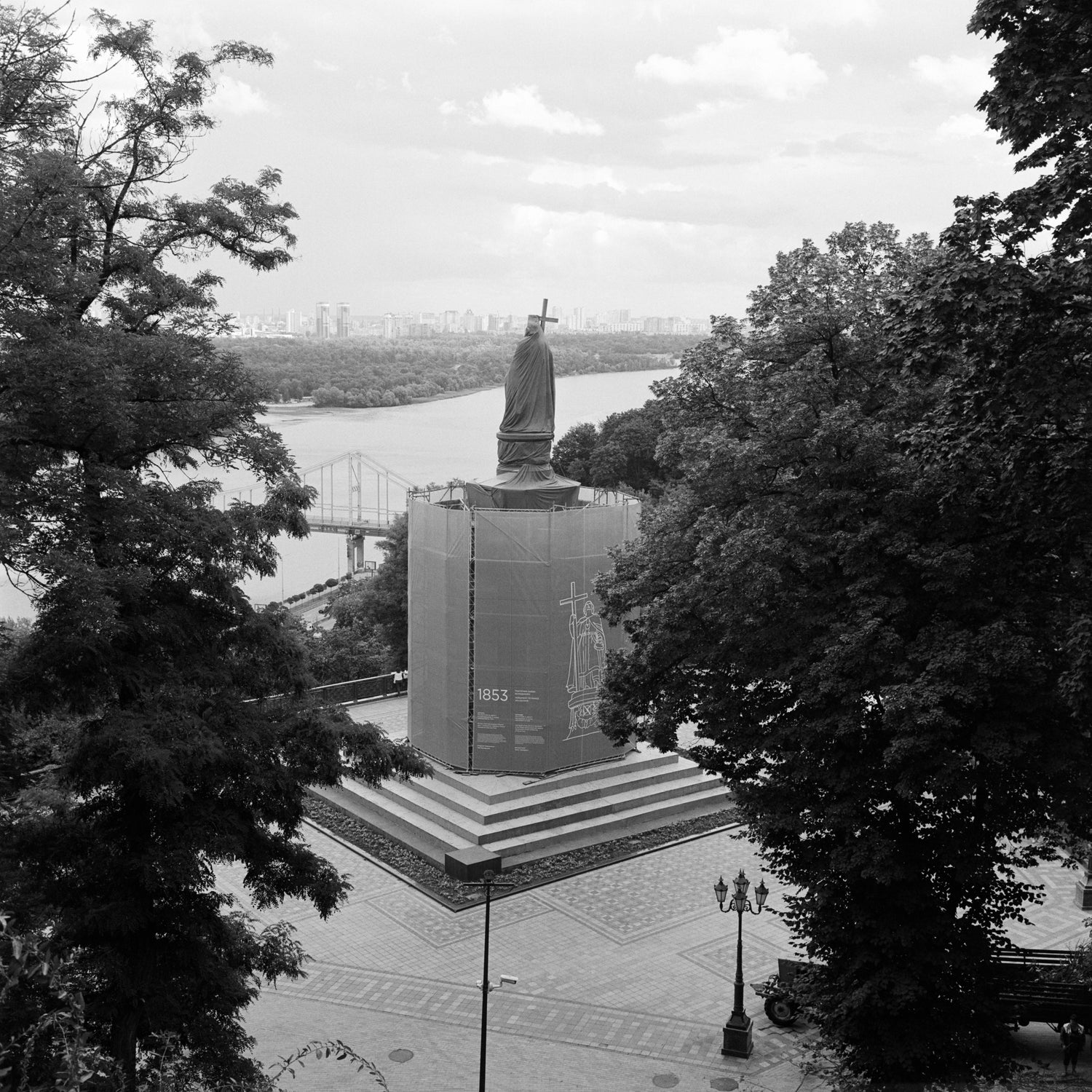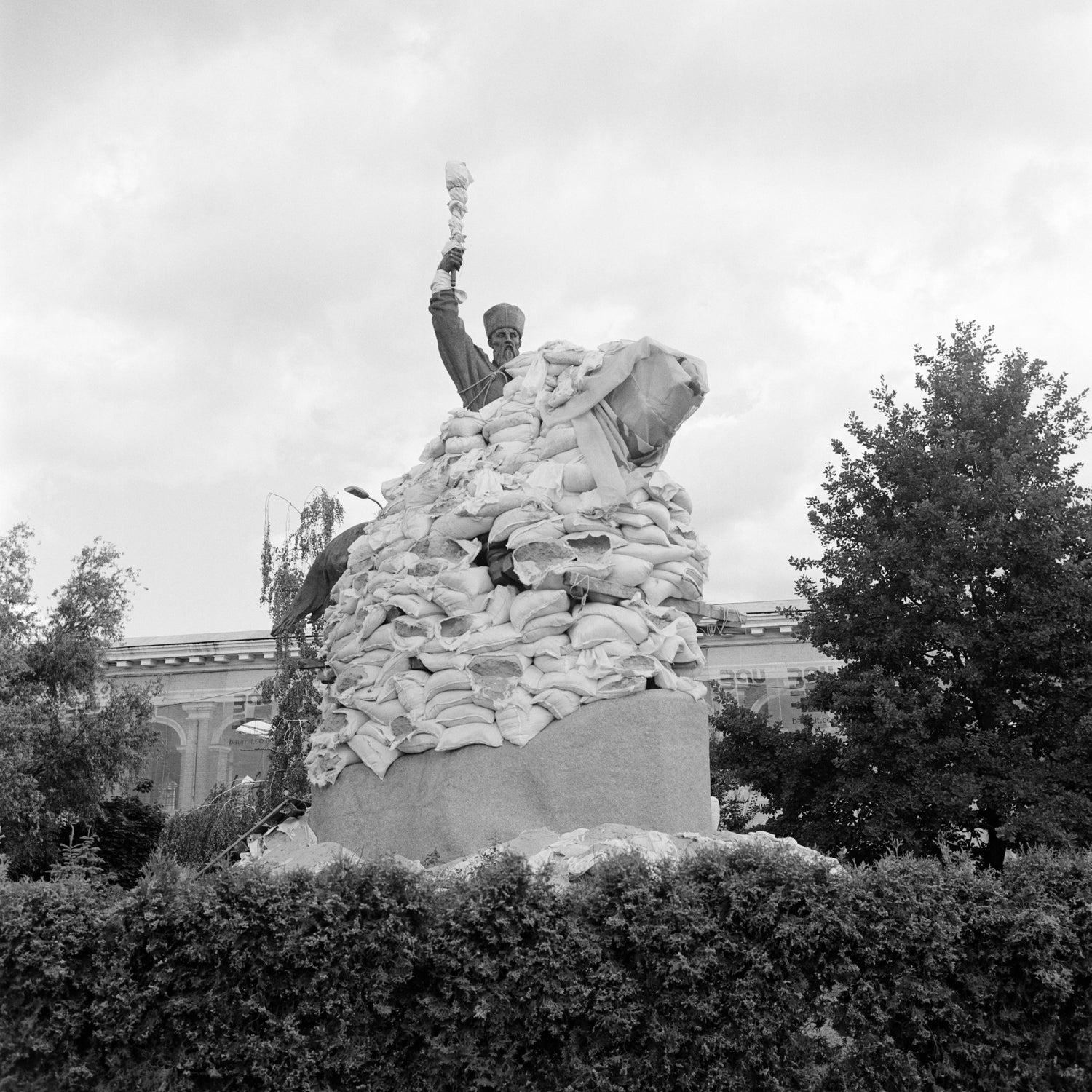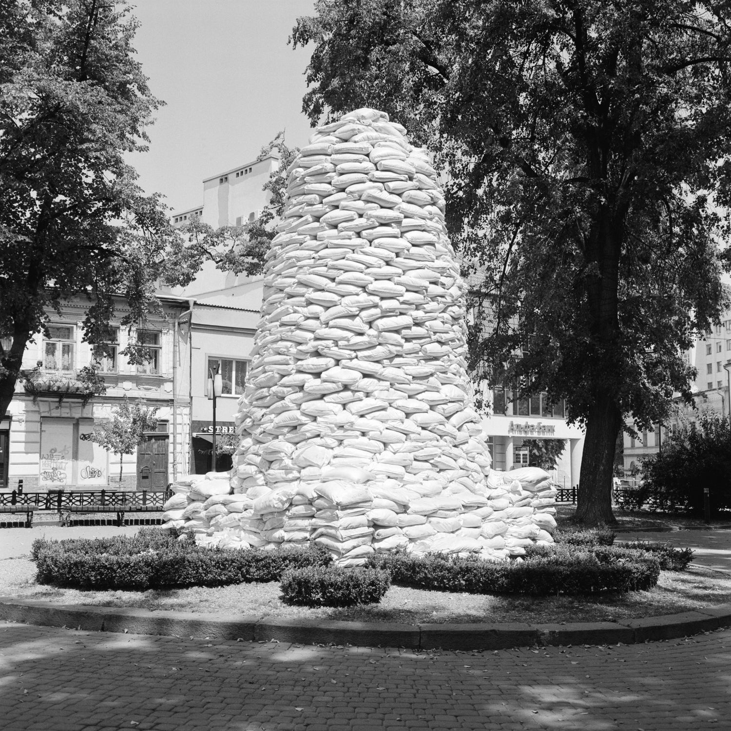 There is also one antagonistic, distracting element: a diptych of two photos of the same destroyed monument to Shevchenko in Brodzianka. The first one is an unambiguous representation of the destruction caused by the war, but limited to the object – that is, the monument itself. The second, on the other hand, shows the monument against the background of completely bombed blocks, showing the real tragedy of people living in a country torn by war. Maybe this project is not about monuments at all, as it might seem?“