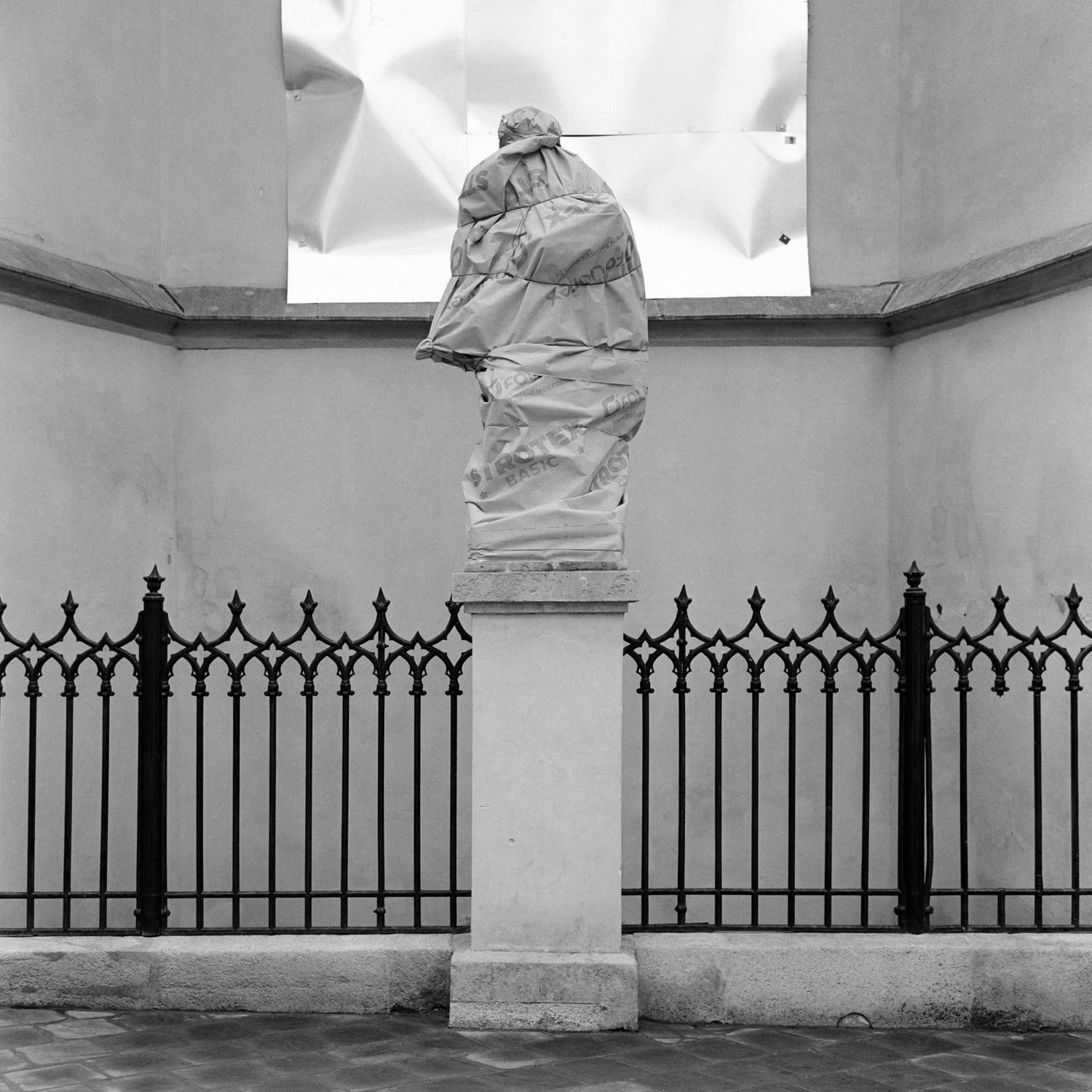 “It is a typology consisting of 20 photographs of secured sculptures (13 shown here), including figures of poets, saints, national heroes, but also mythological figures.