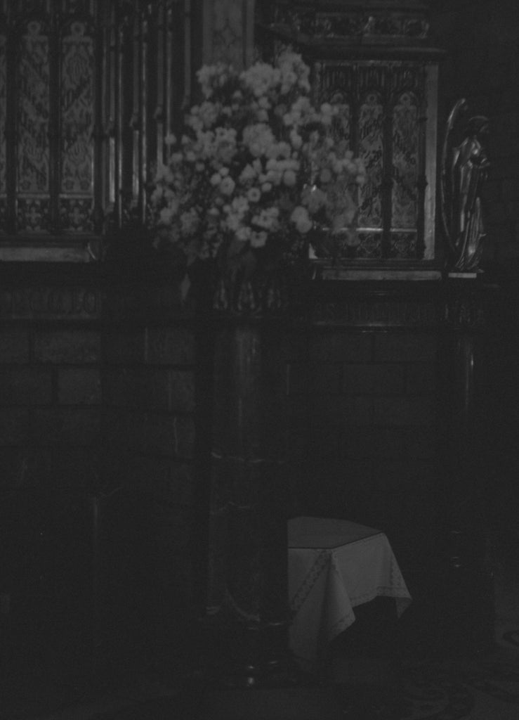 “The first photographs of the series « Les yeux fermés » presents us with a succession of scenes where different places seem to be taken over by the same feeling of loss. Except for a seated body on the floor of a room, unfold a succession of scenes from the empty rooms in an apartment plunged in darkness. Followed by several religious interiors that have also been deprived of light.