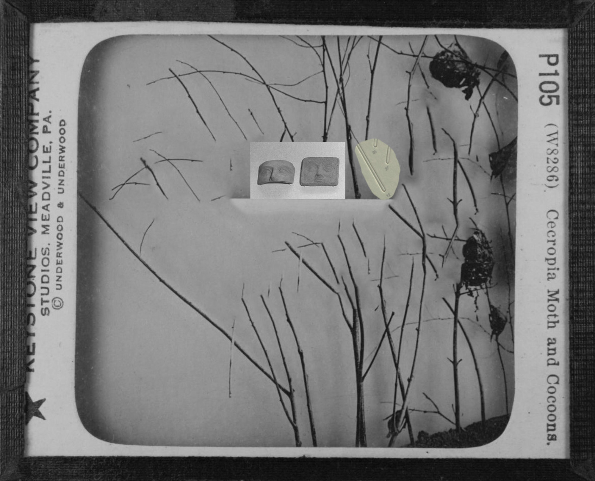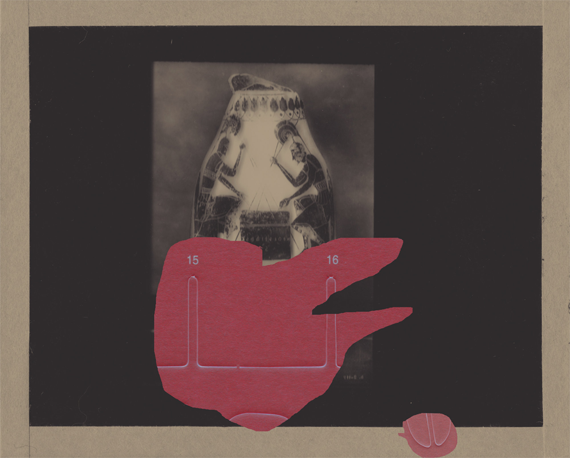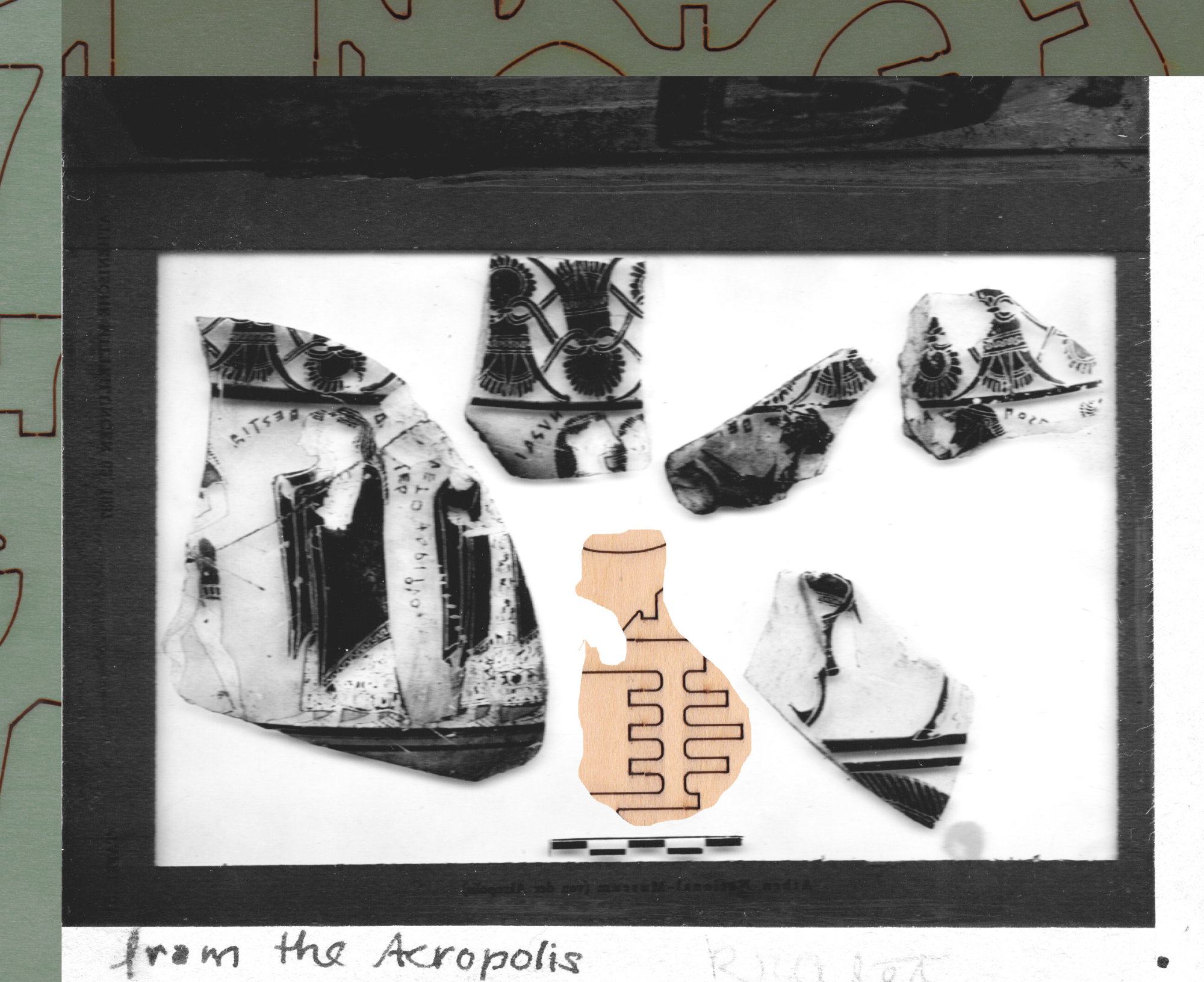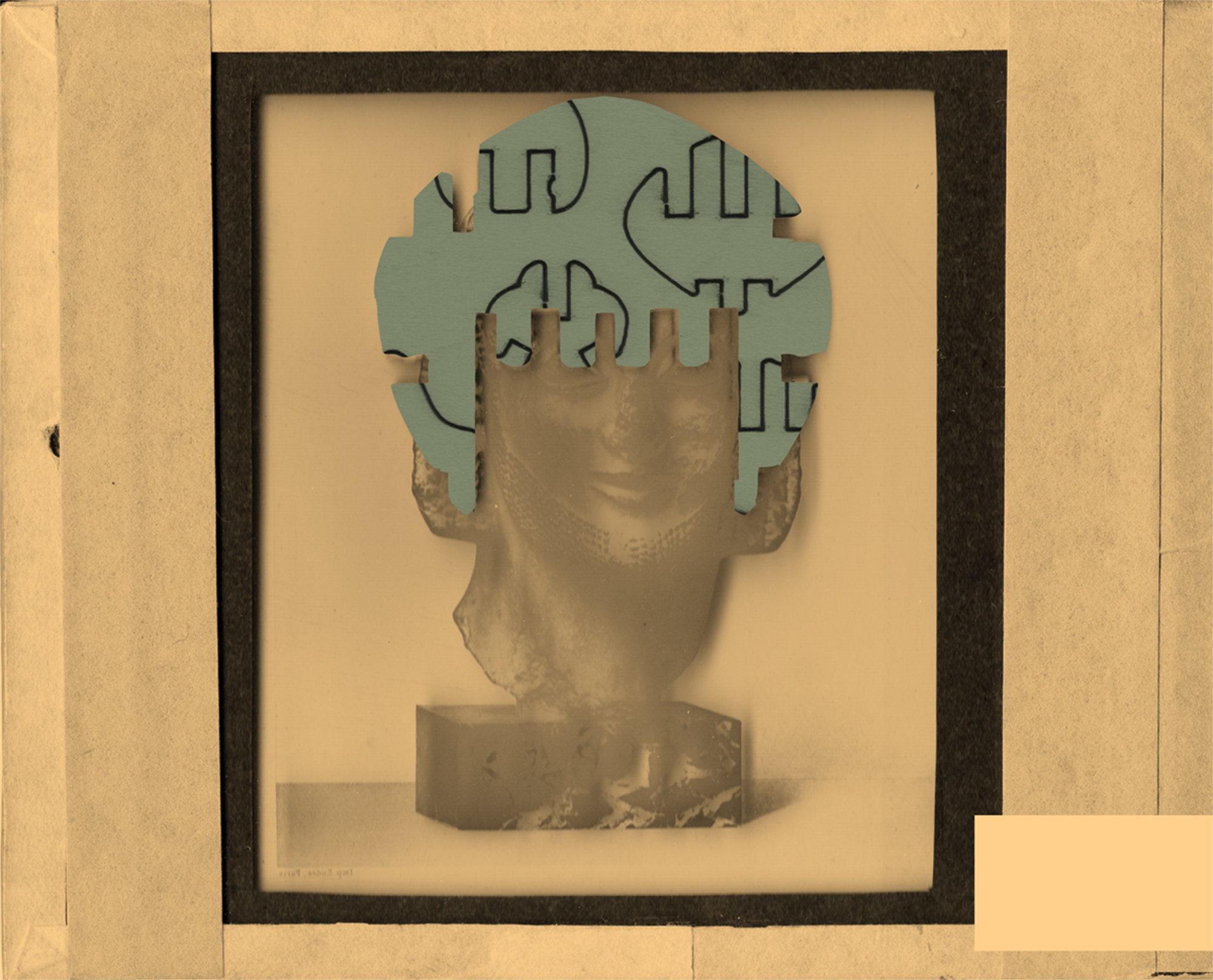 Other than the actual magic lantern slides, I have been adding to my collection some digitized slides downloaded from different online sources and started to include documents with natural elements and landscapes too. Some of my assemblages are made by scanning the original documents along with some abstract puzzle cut-outs, while in others I would rework a digitized document directly on photoshop by erasing or adding new elements onto the original file. The result is a collection of finds from the past where statues, vessels, artefacts and nature are all brought together to form a revamped historical categorization. The one element that brings consistency throughout the whole archive is my insertion of abstract cut-outs. Hence, the recurrence of these fabricated elements in almost every slide represents the main criteria under which my classification is recorded.