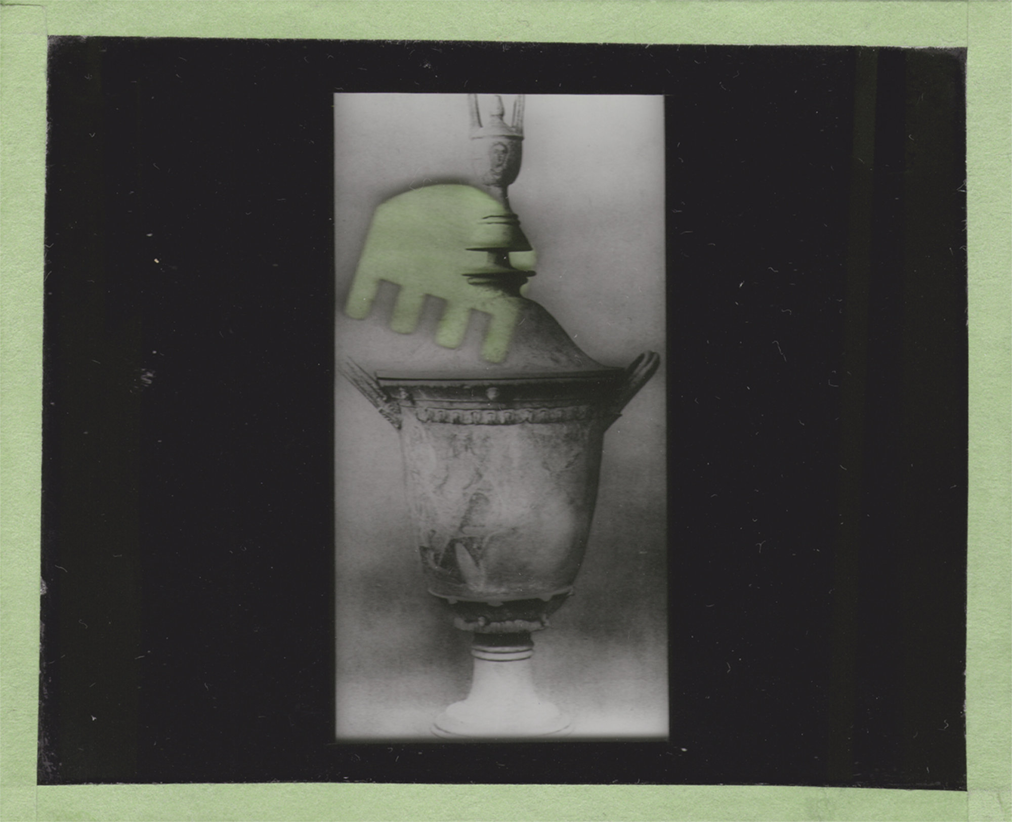 Magic Lanterns is an ongoing series in which I construct collages using discarded glass slides from museums and institutions across the world, beginning with a collection from The Princeton University Art Museum, New Jersey. The staff were disposing of these objects, as they had been in the process of digitising the whole collection, and so the slides no longer had a purpose. Each of them depicted an archaeological finding or sculpture with its corresponding description on one of the sides. I scanned each miniature plates, enlarged and then collaged onto, to playfully accentuate the mysteriousness and fragmented nature of archives. In building my own (archive), unbound by external perspective, I seek to destabilise the linear narratives that have dominated our thinking around the past, and the approaches prevalent in its institutional presentations. I mutate these thought-obsolete objects, halting their deterioration by re-cataloguing them, assigning them new story and meaning while drawing them back to our present context and in connection with my practice. The slides become figments of imagined histories, remnants that have been pushed to the margins, distorted, and drawn back to the centre.