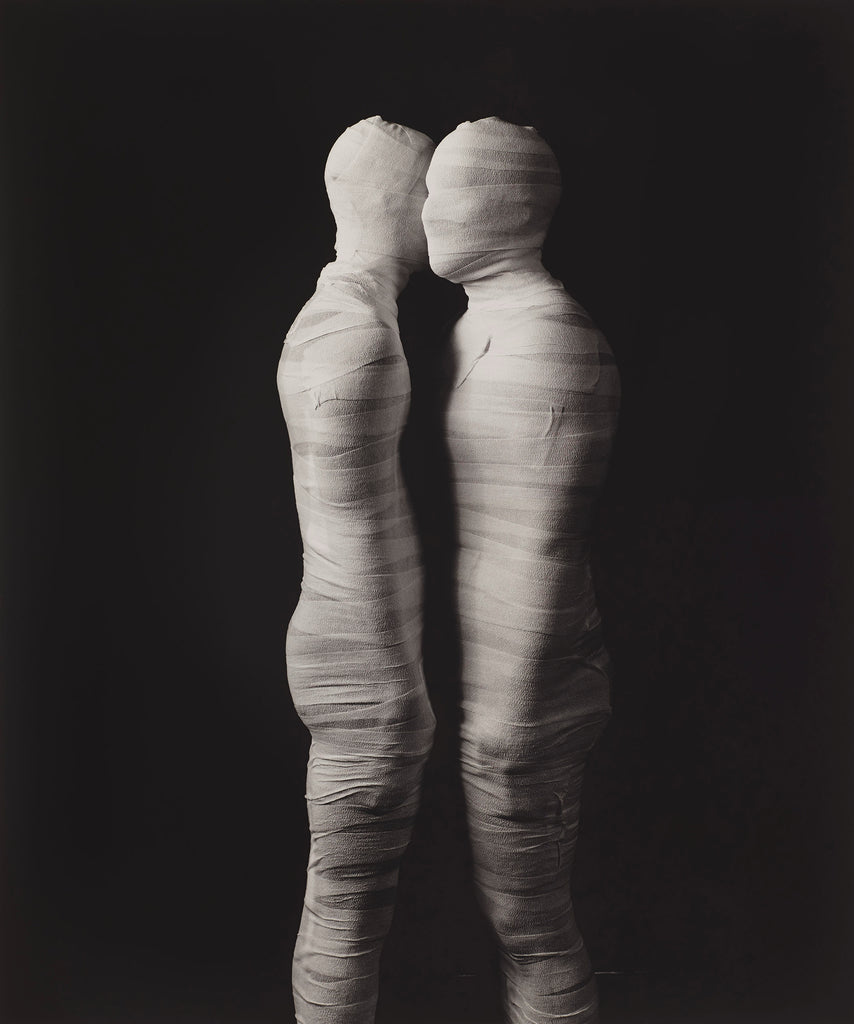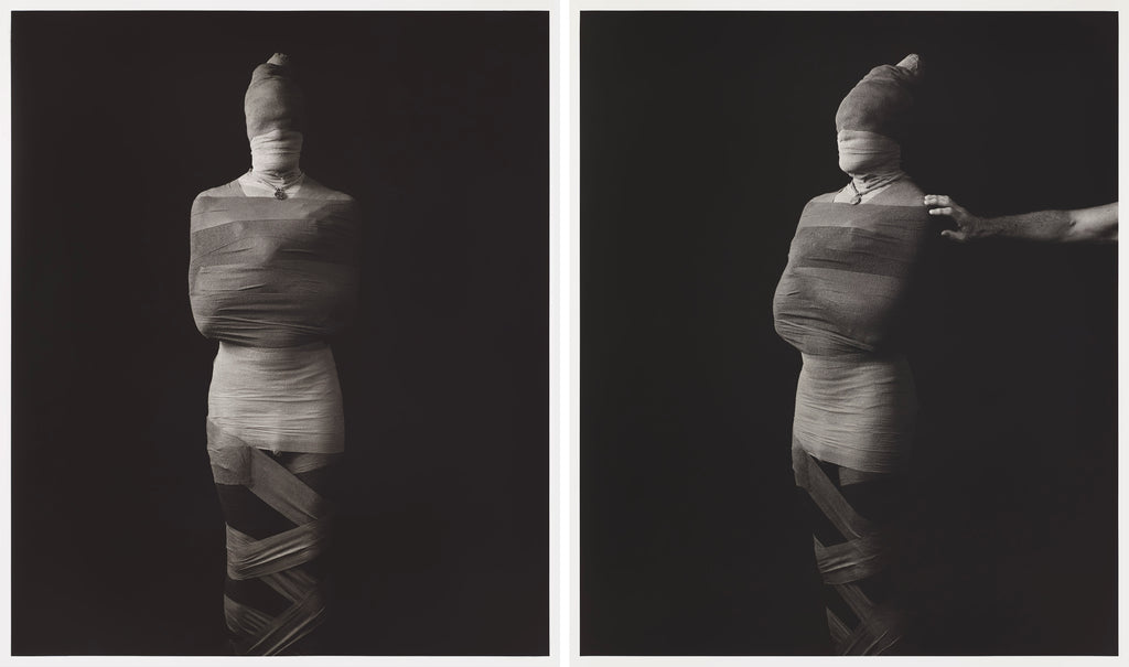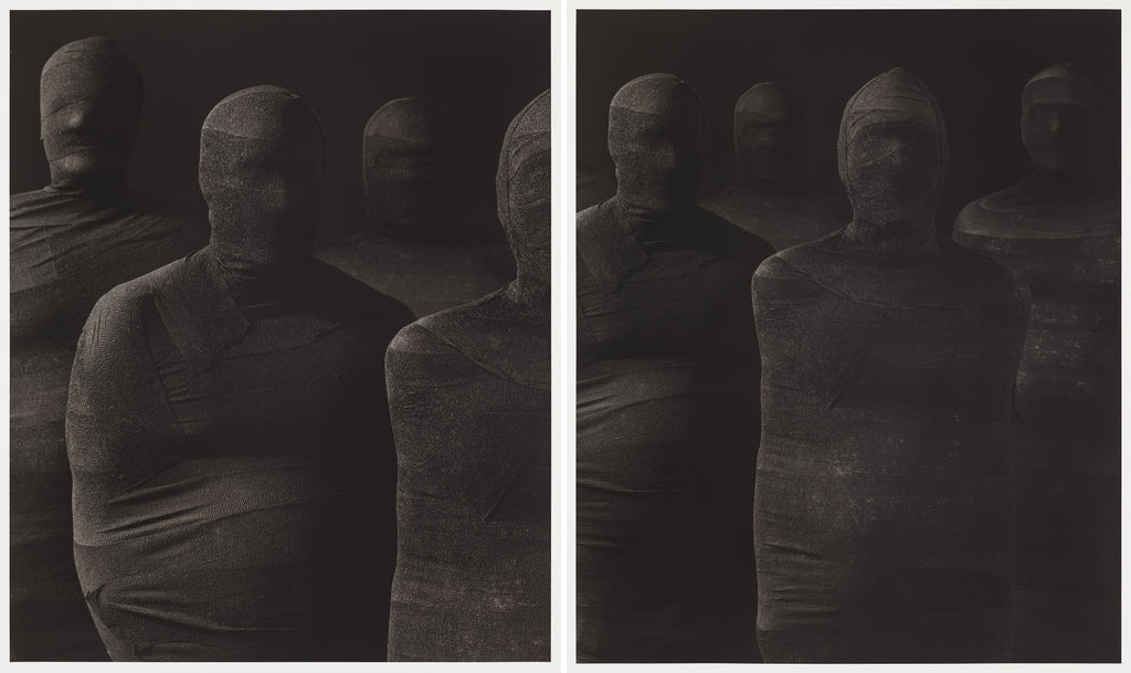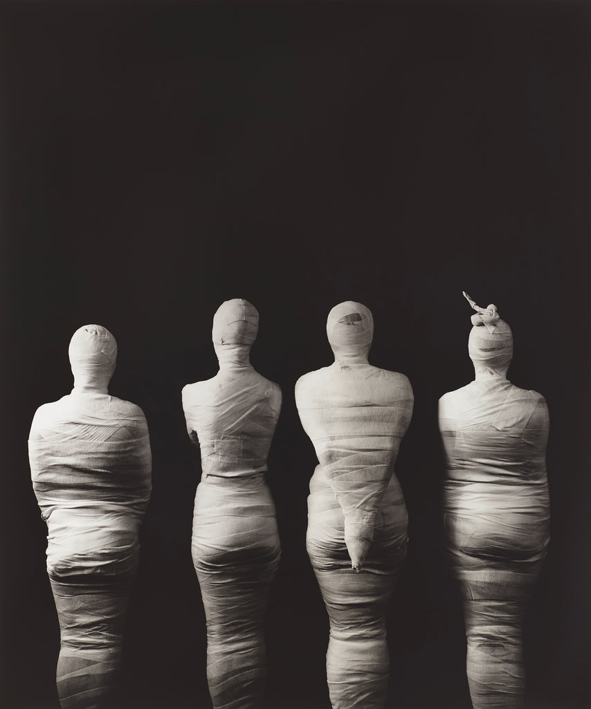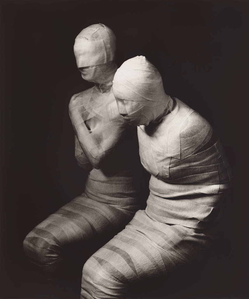 “Then, as a dramatic and extreme counterpoint, Heyert also photographs people who attain transcendence by allowing themselves to be mummified and rendered immobile. Unlike the subjects under hypnosis, who are naked in every sense of the word, the wrapped bodies are intentionally hidden and demobilized so the person within remains a mystery, with their profound inner experiences left to the imagination of the viewer.“