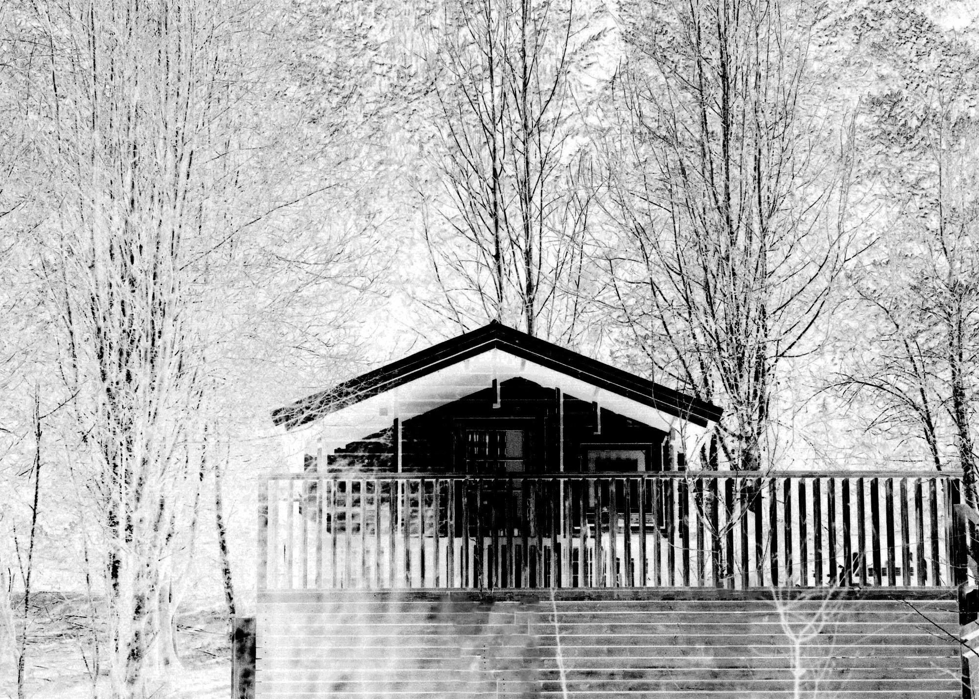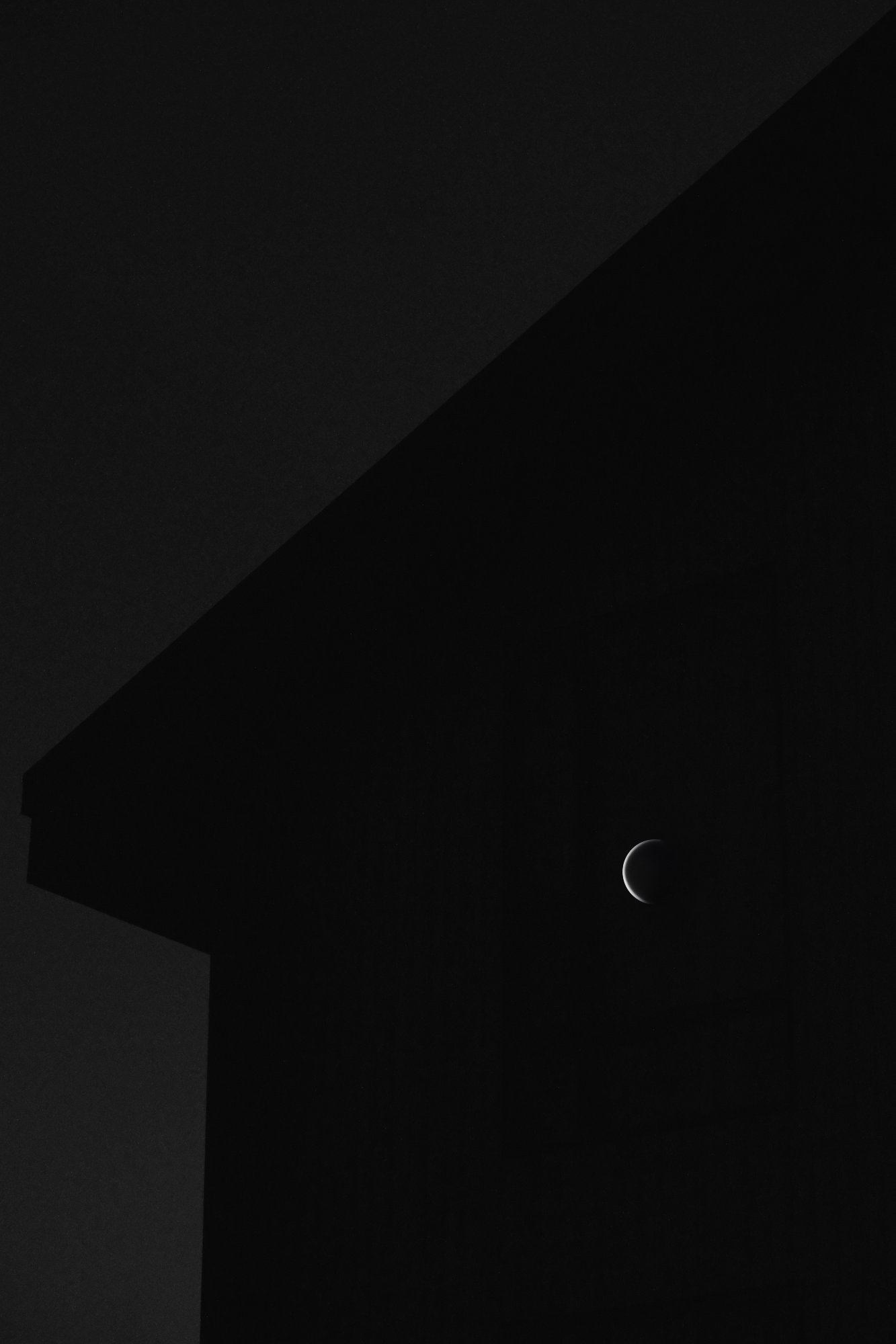 A house stands under the night sky, holding the reflection of an eclipse. Nearby, a small cabin is surrounded by trees, isolated and cut off from the outside world.
