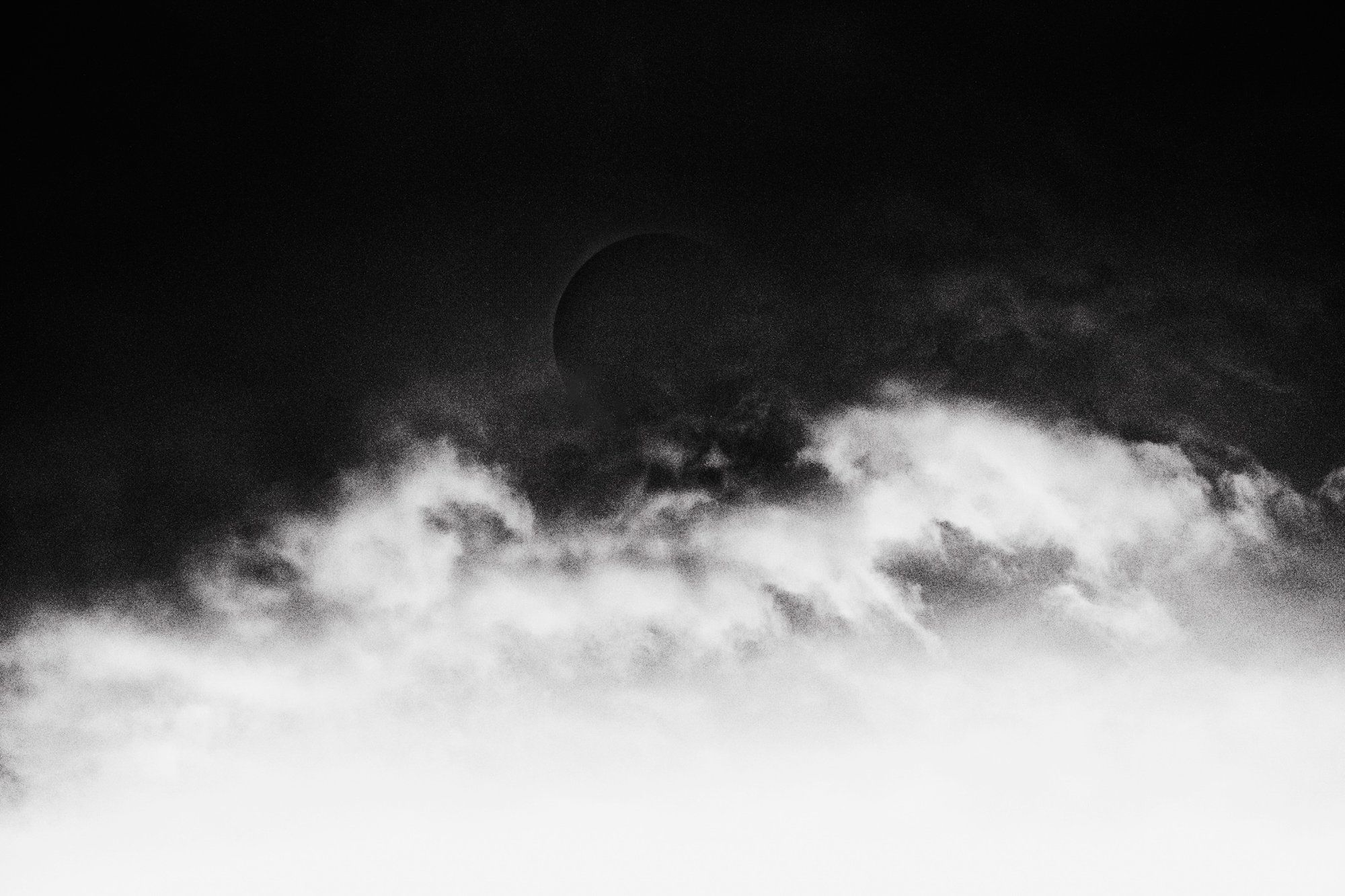 Above the land, an eclipse darkens the sky while the northern lights move slowly, like a quiet signal in the darkness.