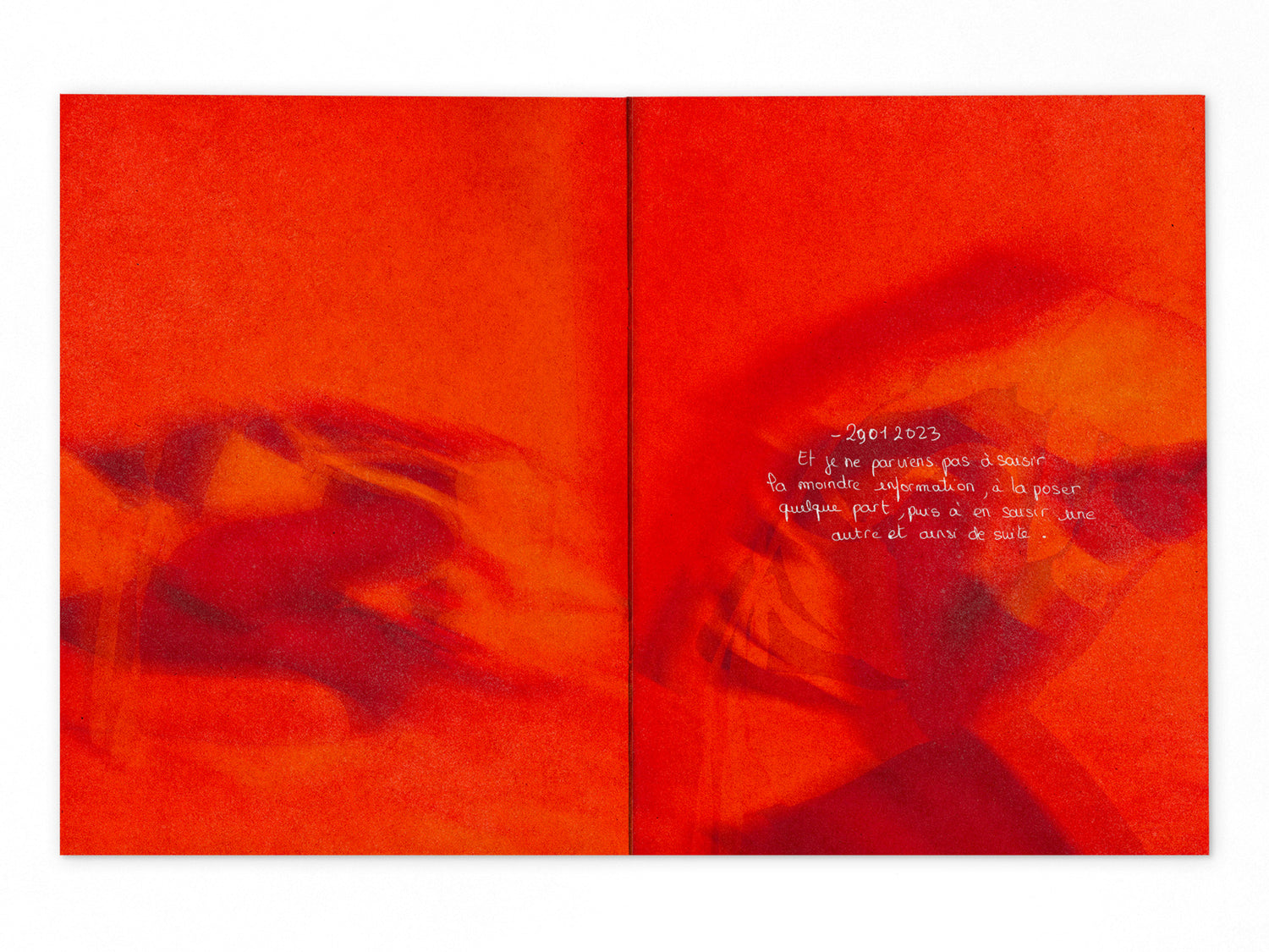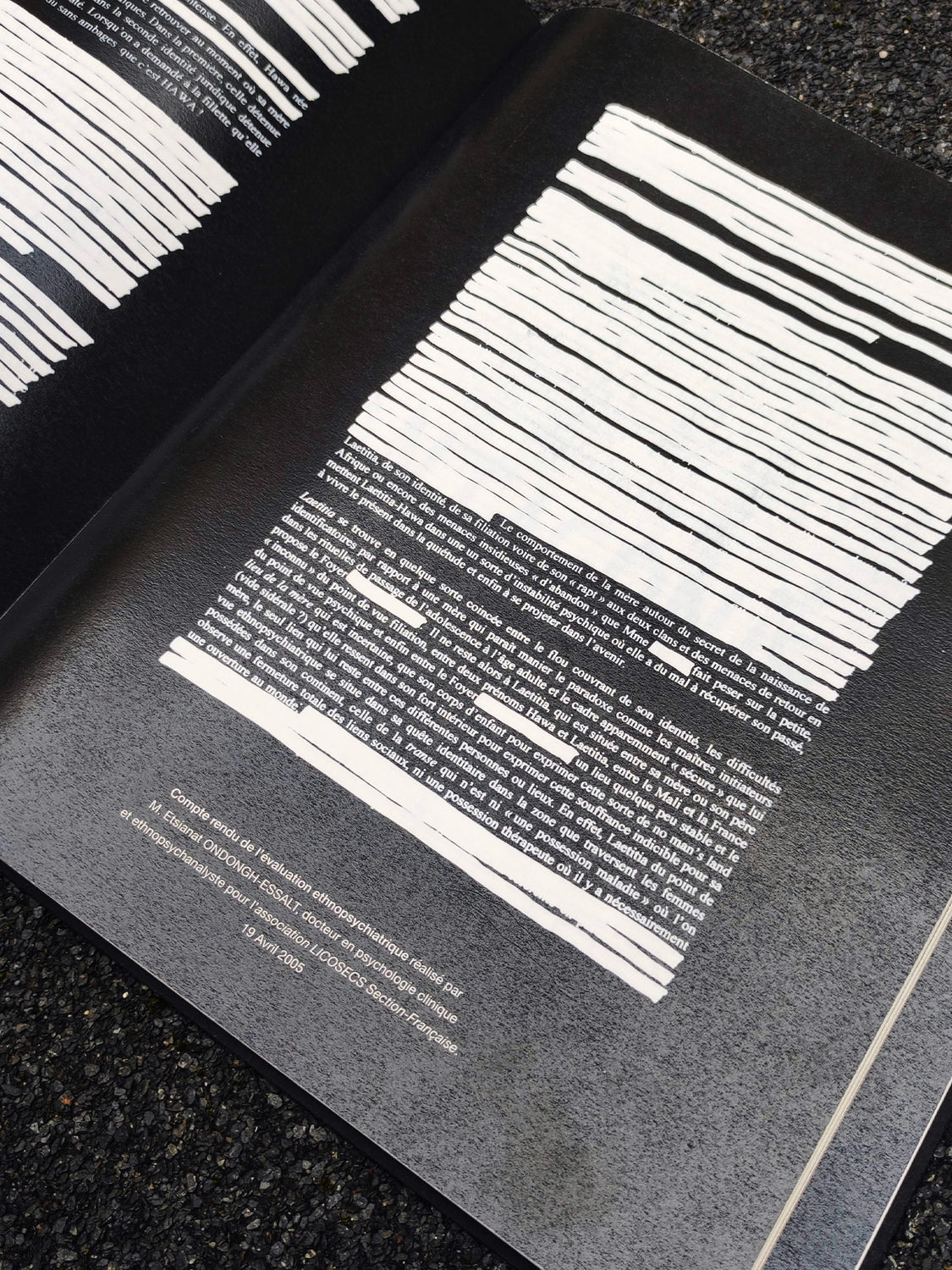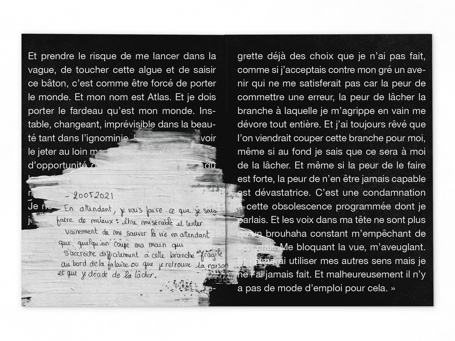– The white pages and the typed text represent the analytical point of view and the black pages accompanied by a handwritten text and these thick streaks of paint, inspired by the palimpsest technique, a practice that consists of a parchment from which the first writing has been erased to be able to write a new text.