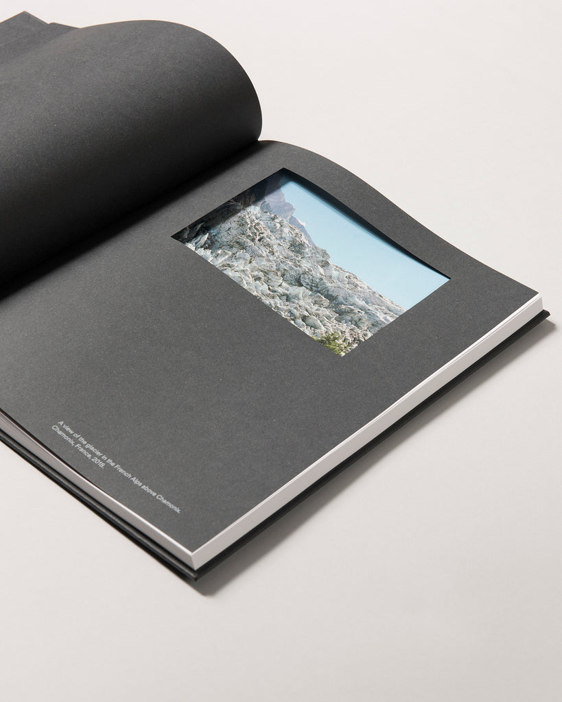 The opening image unfolds as a striking picture-postcard capturing the French Alps glacier above Chamonix. Turning the page reveals the same photograph in its entirety, accompanied by a different caption, exposing not just the pristine nature, but also the reality of an overcrowded place with hundreds of people waiting during one of the many events hosted there.
