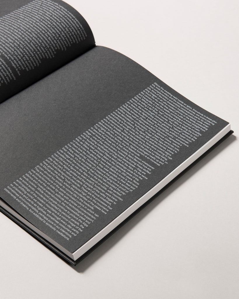 The book vividly juxtaposes grueling natural conditions with the allure of an accessible and glamorous lifestyle, echoing the Alpine paradox. Serving as a self flyleaf book, the use of color in Yes to All corresponds to the featured landscapes. Typography shades refer to snow and ice elements, while the cover and other details borrow hues from the characteristic rock formations of the Aosta Valley and the Western Alps.